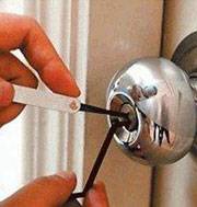 开锁过程:实验所需的是一张制作过的长方形塑料卡片。李强先将这张卡片插入门与门框之间的缝隙,再下滑至锁舌所在位置,最后顺利将房门打开――整个过程用时6秒。“这种方式是较原始的开锁手段,但较常见,发案多见于老式住宅区,小偷主要针对木门和老式防盗门下手。”李强说,这种开锁方式适用于未反锁的状态,对于反锁锁芯或插上保险插销的,无法成功。